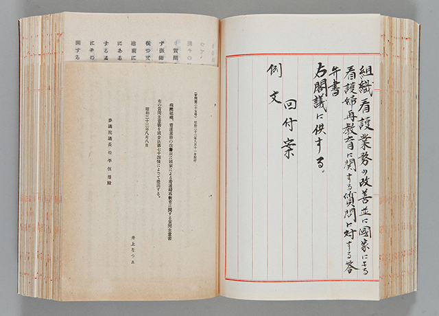 看護婦であった井上なつゑ(1898~1980)は、第1回参議院議員通常選挙で当選しました。掲載資料は、井上が提出した質問書に対する答弁書が閣議に回付された際の文書です。質問書に対して、厚生省は、病院組織については改善指導に努めること、看護婦業務については保健婦助産婦看護婦令(昭和22年7月3日政令第124号)の施行を機会に関係方面に理解と協力を求めること、看護婦の再教育については病院等施設で自主的に行われるよう勧奨し、国庫からの助成についても努力する旨を回答しています。