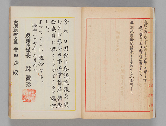社会運動家として戦前から活躍していた奧むめおは、第1回参議院議員通常選挙で当選、昭和40年(1965)まで3期18年間議員を務めました。掲載資料は、奧が昭和27年に日本工業標準調査会委員に任命された際の文書です。奧は、昭和23年から新団体・主婦連合会の会長に就任し、消費者運動を行っていました。