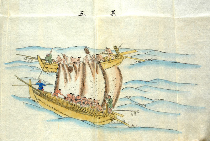明治21年に千本松喜助が開発した「改良揚繰網」と揚繰網漁法について図解した絵図。