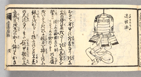 嘉永6年(1853)に出版された甲冑の解説書。甲冑の着方や素早く着る方法などを図入りで紹介。