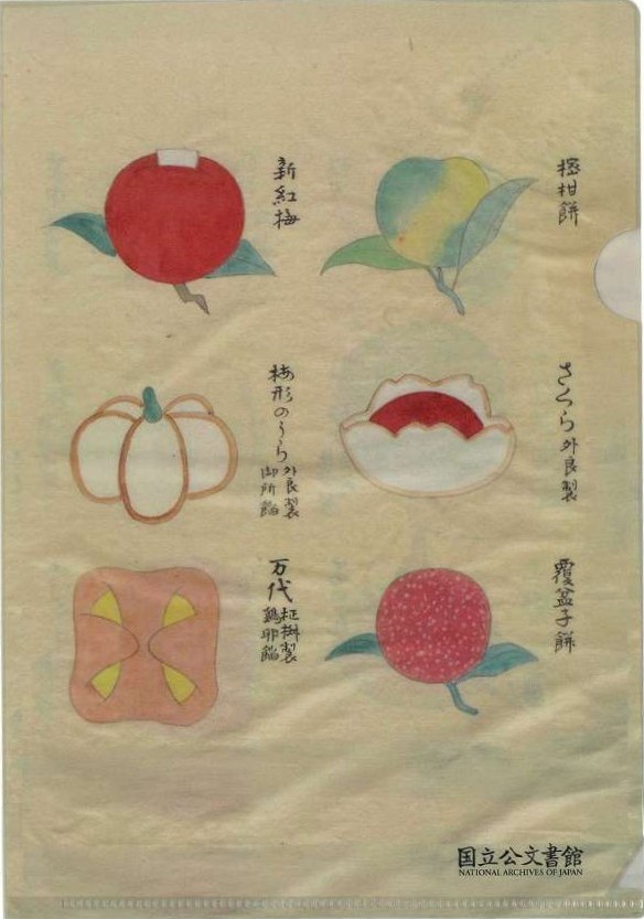 『摂津徴』「御蒸菓子図」(江戸時代のお菓子見本帖)より。色とりどりの和菓子。