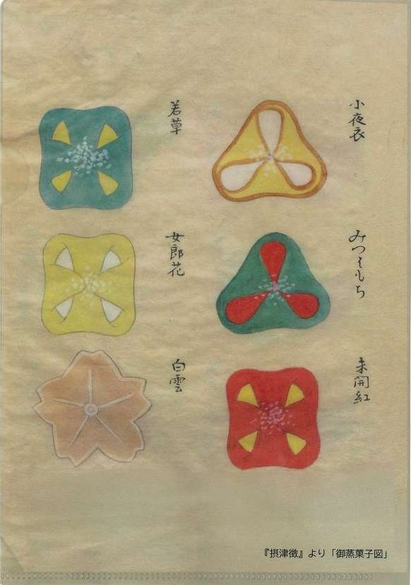 『摂津徴』「御蒸菓子図」(江戸時代のお菓子見本帖)より。色とりどりの和菓子。 サイズ: A5サイズ
