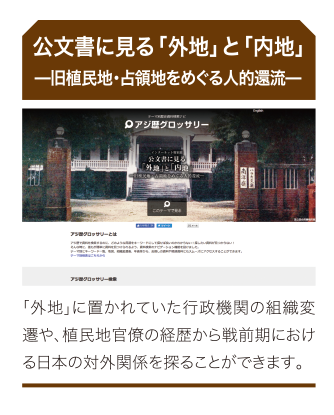 こうした公開資料の拡大という取り組みの一方で、よりユーザーの利便性を高めるための取り組みも進められています。例えば、特定のテーマに沿って資料検索をナビゲートする「アジ歴グロッサリー」や、検索のためのキーワードを事典形式で提示する「アジ歴地名・人名・出来事事典」といったコンテンツが公開されています。これらのコンテンツは、データベース検索と連動しており、より利便性の高い検索機能となっています。