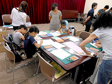 当館所蔵資料の画像(トンボ、チョウ、カッパなど)を塗り絵の和綴じ本にした、「世界に一つだけの君の本を作ってみよう!」では、子どもたちが絵に思い思いの色を塗り、真剣なまなざしで糸を通していました。また、当館ホームページのデジタルギャラリーから選んだ画像(江戸城の絵図、明治時代の切手の見本、洞爺湖サミットの広報パネルなど)を神経衰弱ゲームにアレンジした、「遊ぼう!パネルカードゲーム!」では、親子や兄弟姉妹が絵の特徴を声に出し、夢中でカードを取り合いました。どちらのコーナーも、多くの参加者、それを囲む見物客であふれ、大いに盛り上がりました。