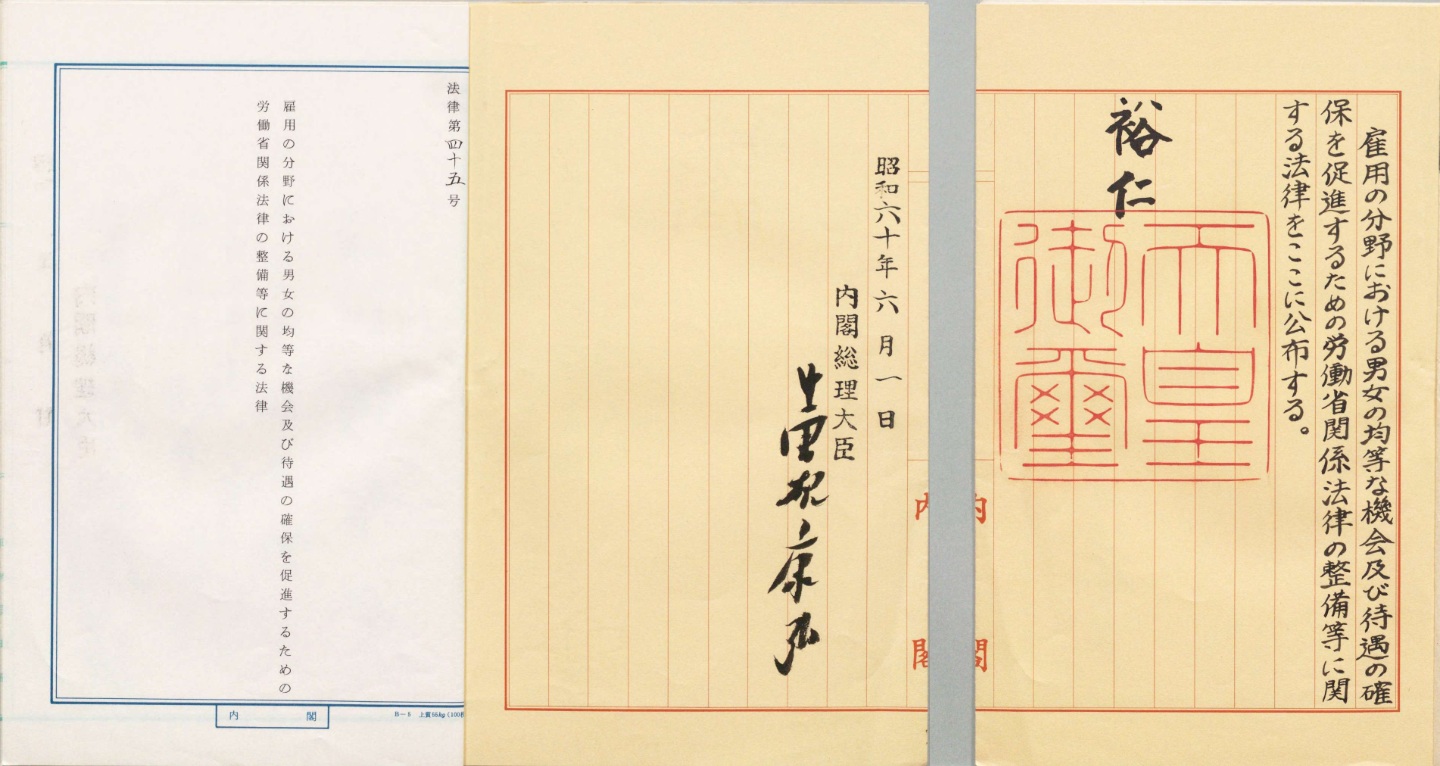 展示期間:12月13日(土)〜12月26日(金)午前9時15分〜午後5時00分 ※12月14日(日)、21日(日)は休館 展示場所:国立公文書館 東京本館 常設展示室 ![]() 男女雇用機会均等法(以下、均等法)は、職場における性別による差別を禁止し、男女とも平等に扱うことを定めた法律です。 その制定は、国際婦人年や女子に対するあらゆる形態の差別の撤廃に関する条約(以下、女性差別撤廃条約)といった国際的な動きを受けたものでした。均等法は、昭和60年(1985)に、日本が女子差別撤廃条約を批准するにあたり、国内法の整備等の一環として、勤労婦人福祉法(昭和47年公布)を全面改正する形で公布されました(翌年施行)。 制定当初は、定年や解雇については男女間の差別を禁止していた一方、募集・採用や昇進・昇格に関する事項では、事業主に対する努力義務規定となっていたことから、内容が不十分とも言われました。しかし、これらの多くは、平成9年(1997)の改正で禁止規定となり、平成18年の改正では、男性に対する差別も禁止されたほか、間接差別の禁止、妊娠、出産等を理由とした不利益取扱いの禁止などの規定も設けられました。 |