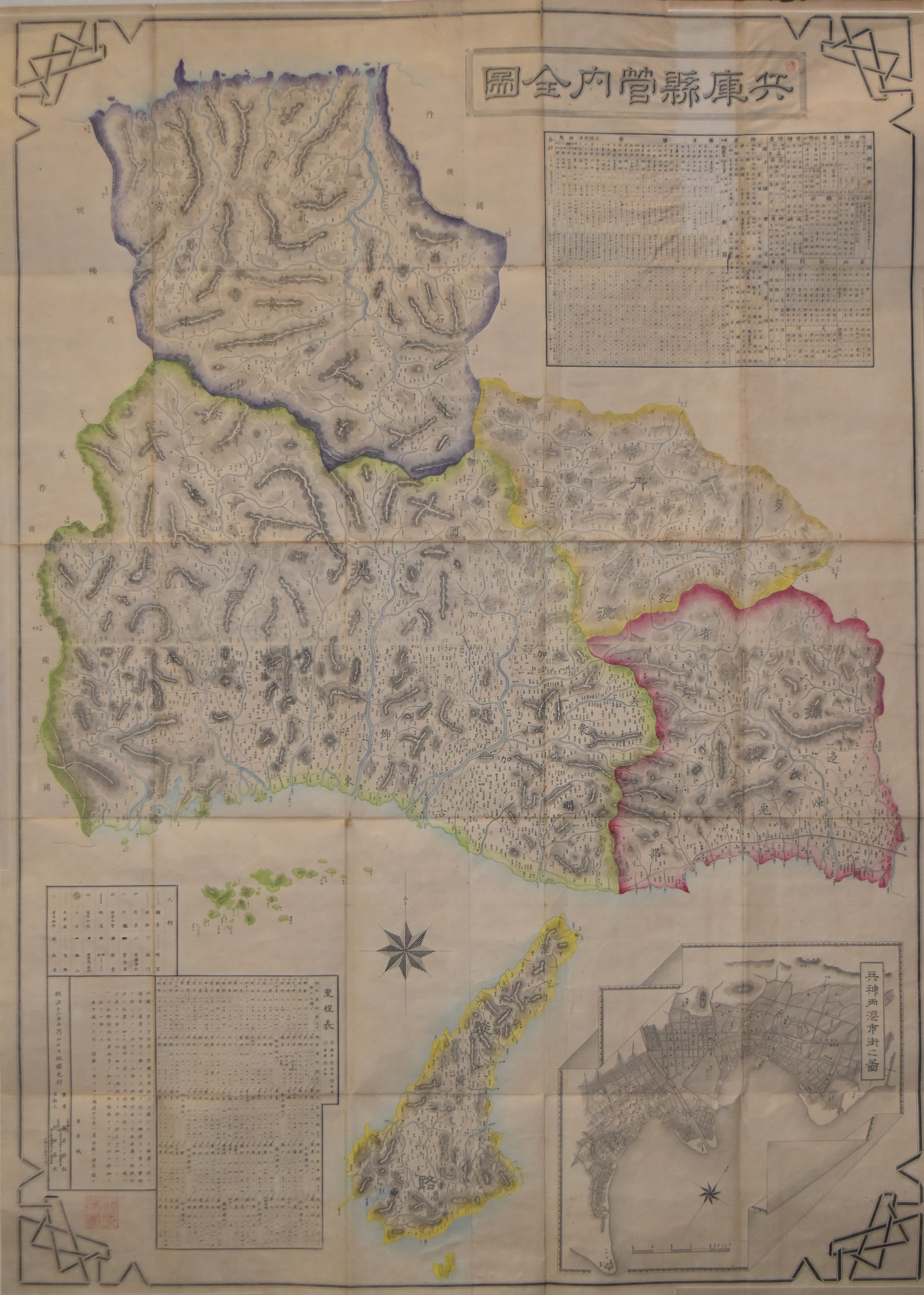 次に、「兵庫県管内全図」(項目番号7)がある【図3】。この地図は、明治12年(1879)に作成されたもので、兵庫県を構成する旧5国を色分けして示している。地図右上には、県内の行政機関の所在や、神社、寺院の名称、各地の物産、港湾などについての情報があり、右下部分には、開港場となった神戸の街と港の地図が掲載されている。兵庫県は、3次にわたる県域の改編によって、明治9(1876)年にほぼ現在と同じかたちとなったが、その当時に作成された兵庫県域のわかる地図を当館の所蔵資料から探したところ、この資料を再確認できた。当館がいくつか所蔵する兵庫県全体の地図のうち、最も古いのがこの資料である。「兵庫県の誕生」という章の展示作業を行うことで再確認できたものであった。
