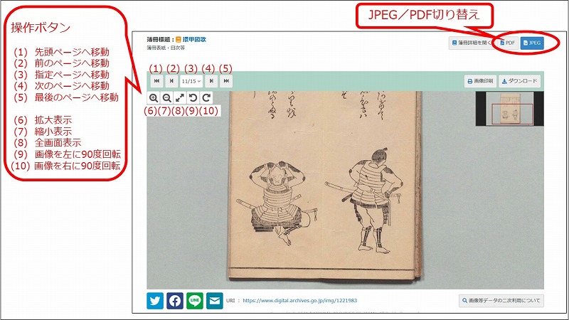 DAの画像提供を動的変換とする方針と共に、閲覧画面は基本とする画像閲覧のフォーマットをPDFからJPEG形式に変更することとした。その際、JPEGとPDFどちらの閲覧においても利用者の操作性が大きく変わらないよう配慮し、閲覧画面の使い勝手の改善を図った。具体的には、JPEG形式の閲覧画面は、これまで拡大・縮小とページの移動などの操作しかできなかったが、画像の全画面表示(図 2-(8))や表示画像の回転操作(図 2-(9)・(10))をボタンでできるようにしている。また、スマートフォンやタブレット端末といったスマートデバイスでの操作は、従来のフリックやタップはもちろん、PC版で利用している時と同様の操作ができるようにした。スマートデバイスを利用することが日常的なものとなってきており、DAのデフォルトの閲覧画面をJPEG形式としたことで、利用者はソフトウェアや端末環境に依存せずに画像を利用することが可能となったと考える。なお、従来のPDF形式も、画像閲覧画面の右上にあるJPEG・PDFボタンで表示の切り替えをすることで、閲覧画面で利用することができる。