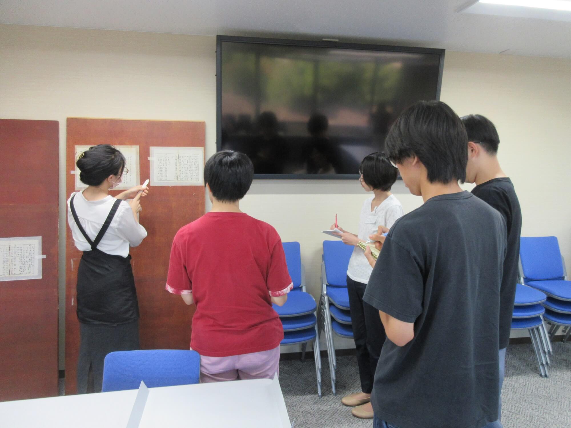 7日目の8月29日午前は、国立公文書館の最近の取組の内容と統括公文書専門官室の業務説明をいただいた。 次に、電子公文書等・デジタルアーカイブの業務説明を受けた。まず、よく使っているデジタルアーカイブの便利な機能と使いにくい機能に関するディスカッションを行った。次に、国立公文書館デジタルアーカイブの機能、業務についてご説明いただいた。その後、国立公文書館の電子公文書等の移管・保存・利用システム(ERAJ)について簡単な紹介をいただき、基本的な移管、保存、利用方法などについてご説明いただいた。この講義では、実際の作業を通して、ERAJを効果的に使って文書情報を管理・検索する方法をよりよく理解できた。この講義を通じて、ERAJについて初めて知り、実際に操作をしていくための基礎的な理解を深めることができた。午後は、利用と修復に関する実務研修を受けた。利用の業務は、書庫から資料を出納する方法、出納した資料を元の排架位置に戻すための付箋を挟む方法、及びその記入方法、誤返却防止や要審査情報の提供ミスを防ぐ方法を学んだ。それらの方法は、必要な情報をスムーズに取得するために非常に重要で、作業効率の向上に役立つことを実感した。修復の業務は、虫損のある紙のドライクリーニング、生麩糊と和紙を使った裏打ち作業、損傷を受けた資料を綴じ直す方法の1つとして、和装本を使った四ツ目綴じのやり方、裏打ちで仮張りした和紙を剥す作業を体験させていただいた。特に裏打ちの作業で、和紙を慎重に剥がし、資料を傷つけないように気をつけ、軽く押して和紙が資料にしっかりと密着するようにし、気泡やシワの発生に注意し、貼り付けた和紙が乾燥するのを待ち、しっかりと資料に固定されていることを確認する方法を学んだ。
