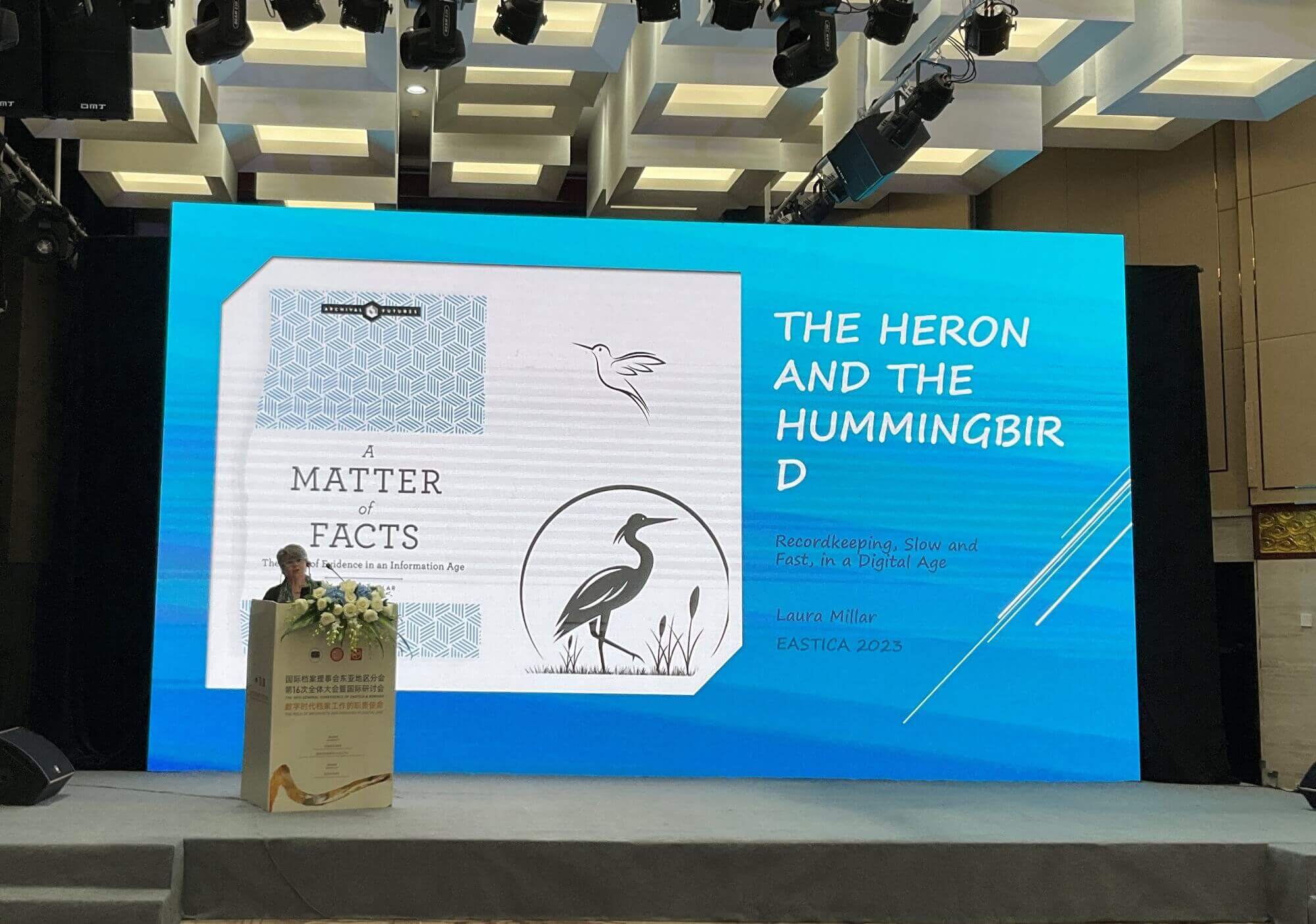 獲物を捕まえるまでじっくりと待つサギと、次から次へ蜜を求めて動きまわるハチドリが、それぞれ電子記録登場以前のアーキビストと電子記録登場以降のアーキビストのメタファーとして表現された。基調講演者は、電子文書登場以降にアーキビストの在り方は変化しており、現代のアーキビストは証拠となるアーカイブズやデータが収蔵されるのを待つのではなく、電子文書を真に保存し、将来の証拠とするために、作成者とも協働しながらつねにハチドリのように情報と証拠の資源から資源へと動きつづける必要があると説明した。重要なのはいかに証拠の源を取得し、保存し、利用できるようにさせるかであり、その源が真正で、信頼できるものであり、正確であるための行動をとることである。アーキビストの戦略は変わるがミッションは変わらない、と結んだ。