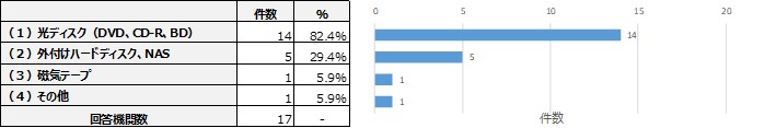また、可搬媒体による送付と答えた17機関に対して、媒体の種類を質問したところ、図表9のとおりの結果となりました。光ディスク(DVD、CD-R、BD)という回答が最も多く、8割以上を占める結果になりました。