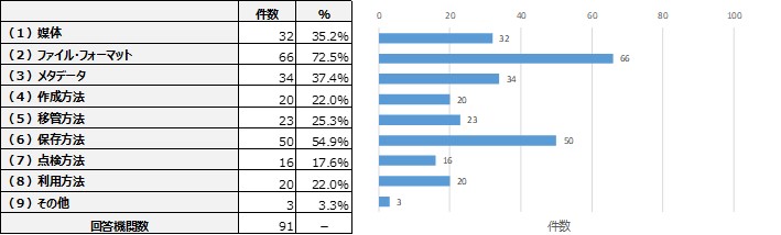 次に、電子公文書等の受入れ実績があると答えた36機関に対して、電子公文書等の保存方法について質問したところ、(1)~(5)で分散した結果となりました。その中で比較的回答が多かった保存方法として、(1)文書管理システムで保存、(4)外部の記憶媒体(光ディスク、HDD、テープ等)に格納し保存、(5)移管・受入れ時の媒体(可搬媒体)のまま保存といった方法が挙げられます。