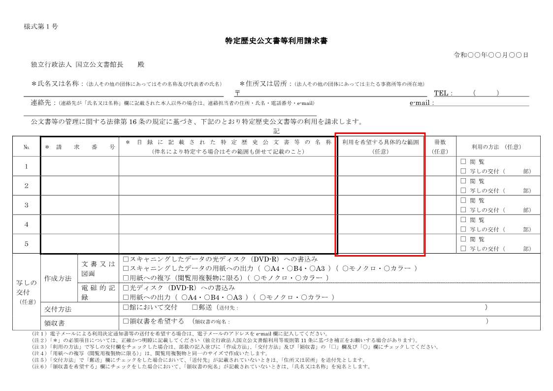 [11]利用請求の場合は「特定歴史公文書等利用請求書」(画像4)の提出が必要だが、簡易閲覧の場合は、その利用請求書を「特定歴史公文書等簡易閲覧申込書」に読み替えて提出していただくこととしている。