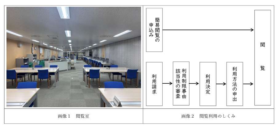 当館の閲覧室には、4~5人掛けの机が7つあり、地図、図面などを広げられる大判資料用の机のほか、車椅子用の電動で高さを変えられる机を一つ用意している。利用者は、閲覧室内にスマートフォンやカメラを持ち込んで特歴等を撮影することができ、撮影に際しては、当館で脚立、卦算、まくらといった補助具を用意している[13]。