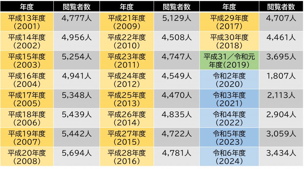 次に、閲覧者数の推移を見た上で、当館の利用業務の変遷をたどってみたい。画像3は、独立行政法人となった平成13年(2001年)度から令和6年(2024年)度までの閲覧者数を表したものである[14]。24年間の閲覧者数の年平均は、4,407人となっている[15]。平成時代だけで見れば、年度間での増減は多少あるものの、平均で5,000人近い閲覧者数を保っていた。