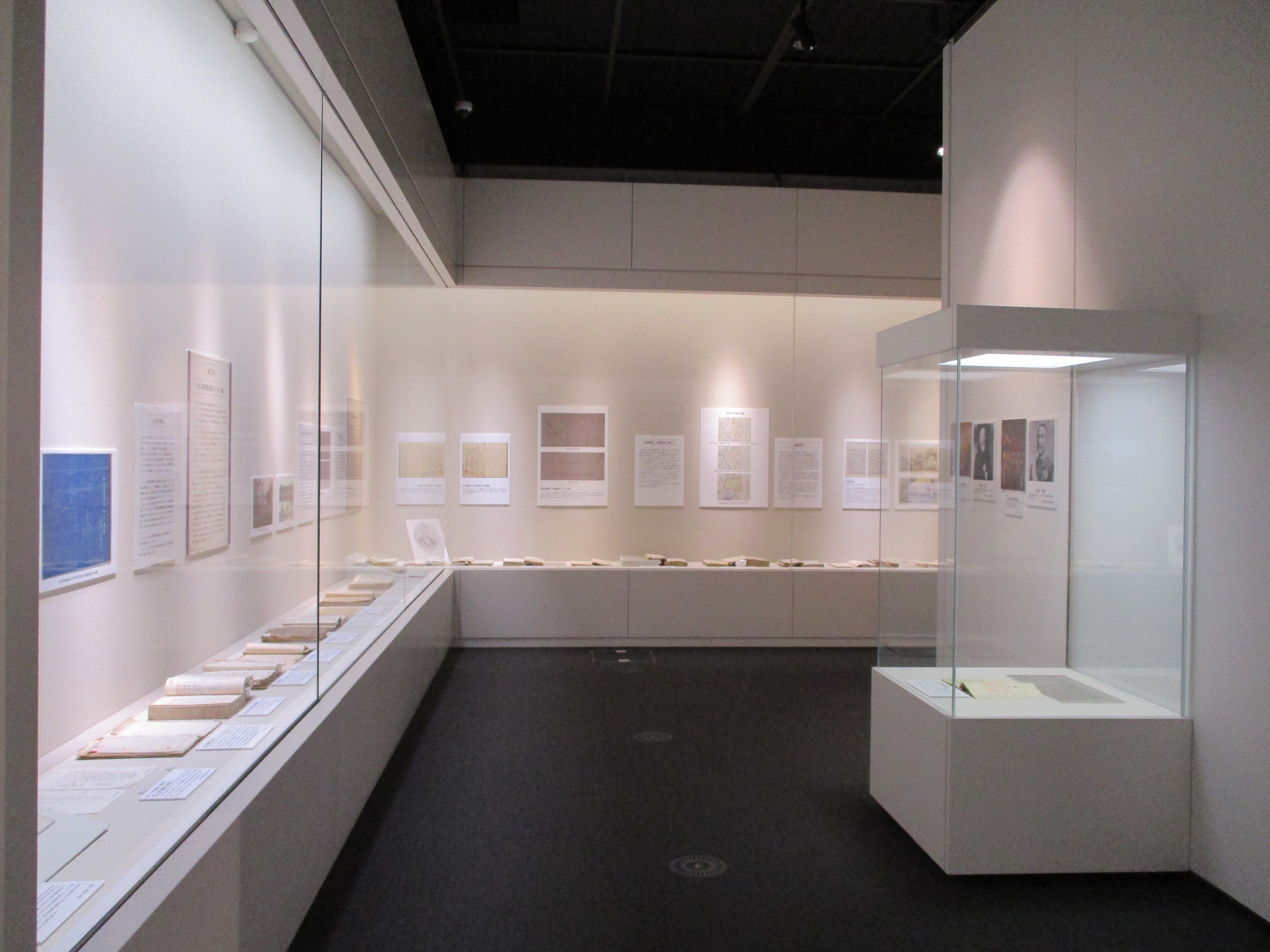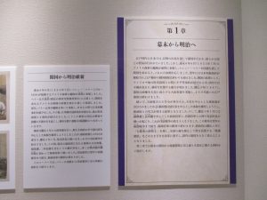 展示は、幕末から昭和40年頃までの通史を4章に分け、そのほかに5つのテーマ展示により構成した。ここでは、各章・項目ついて紹介する。なお、国立公文書館所蔵を(国)、当館所蔵を(郡)と略す。