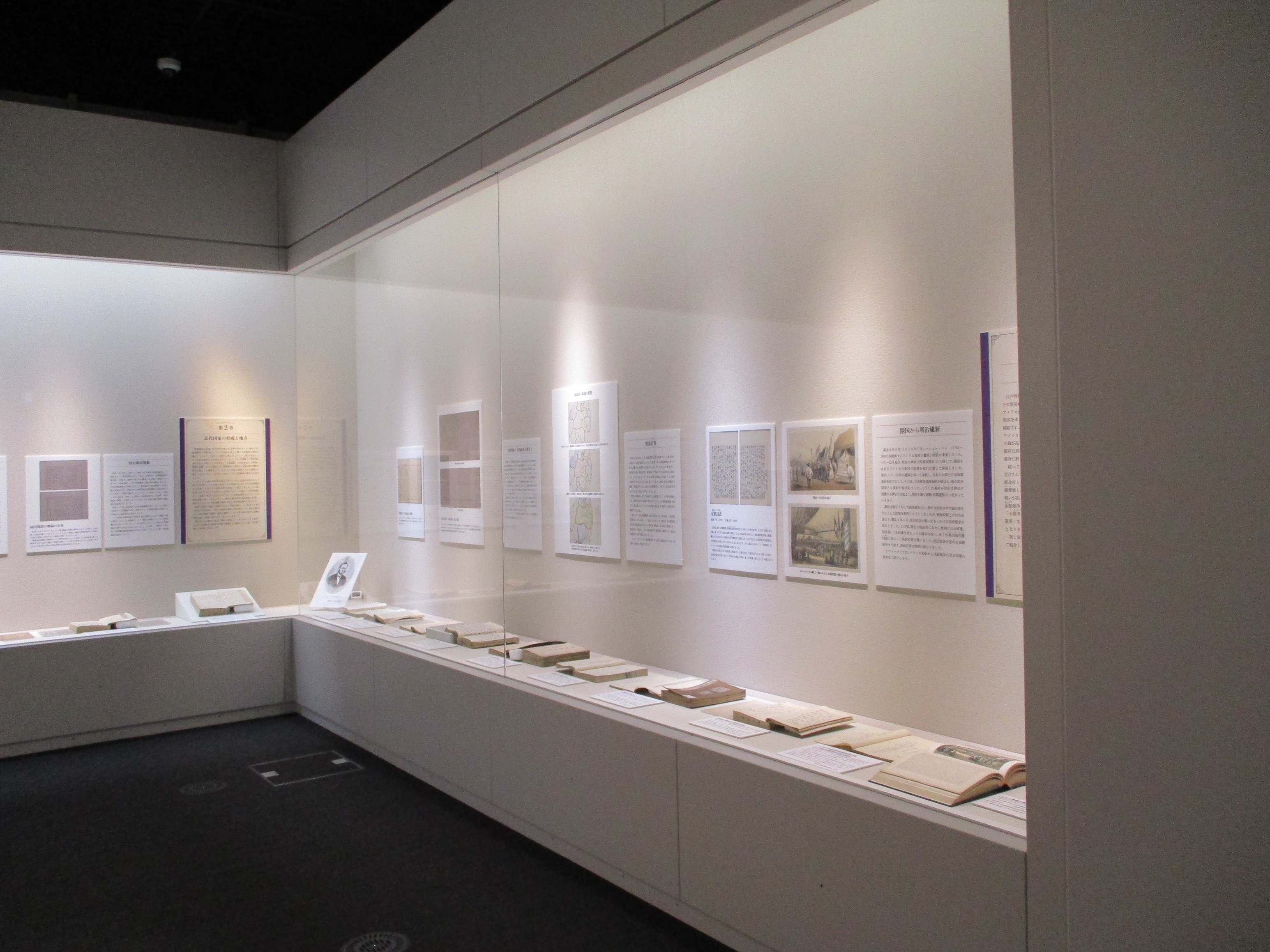 第一章では、旧郡山宿出身で昌平坂学問所教授の安積艮斎が、嘉永6年のペリー来航に際して、アメリカ大統領の国書を翻訳したことを踏まえ、『ペリー提督日本遠征記』(国)や、同じく旧郡山宿の商人が安政五カ国条約締結における幕府の記録を写した「一二月二日亜墨利加使節応接之趣一二月四日同断差出候書付和解」(郡)を展示し、外国と地域の人々について解説した。また「復古記」(国)や、「福島県史料」(国)により、戊辰戦争から廃藩置県の様子を紹介した。