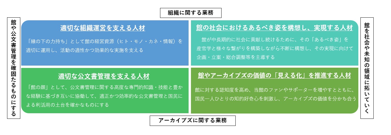 国立公文書館では、職員一人ひとりが自らの成長を図る指針とするため人材の4類型を設定し、この類型を意識して職員の確保・育成を図ってます。